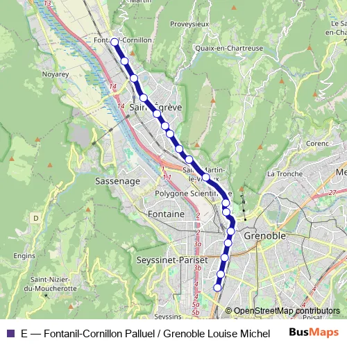 The first stop of the E tram route is Fontanil-Cornillon, Palluel and the last stop is Grenoble, Louise Michel. E (Fontanil-Cornillon Palluel / Grenoble Louise Michel) is operational during everyday.