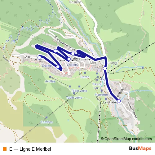 The first stop of the E bus route is Mottaret LE Chatelet and the last stop is Mottaret LE Hameau. E (Ligne E Meribel) is operational during everyday.
