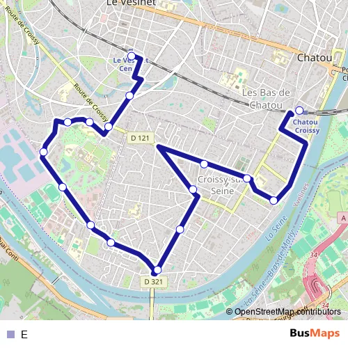 The first stop of the E bus route is Gare du Vésinet - Centre and the last stop is Gare de Chatou - Croissy. E is operational during everyday.