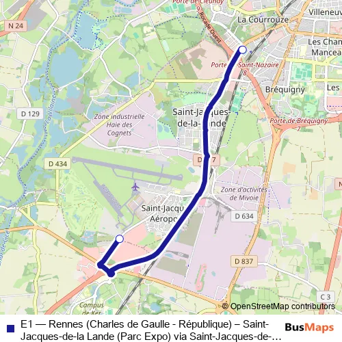 The first stop of the E1 bus route is Parc Expo and the last stop is Saint-Jacques - Gaîté. E1 (Rennes (Charles de Gaulle - République) – Saint-Jacques-de-la Lande (Parc Expo) via Saint-Jacques-de-la Lande (Saint-Jacques - Gaîté)) is operational during everyday.