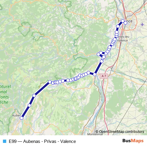 Services on the E99 - Aubenas - Privas - Valence bus start at 06:55 on Monday, Tuesday, Wednesday, Thursday, Friday.