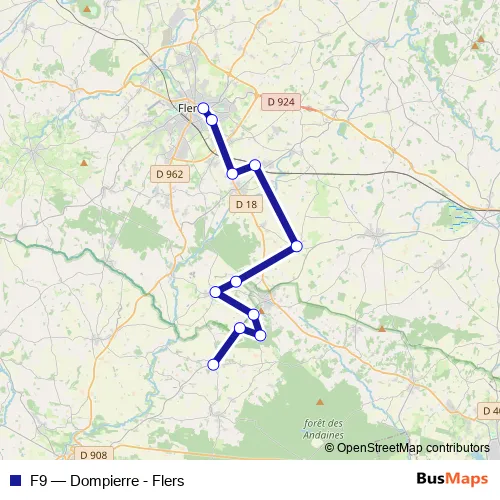 The first stop of the F9 bus route is Gare Scolaire Flers and the last stop is Le Bourg Dompierre. F9 (Dompierre - Flers) is operational during on weekdays.