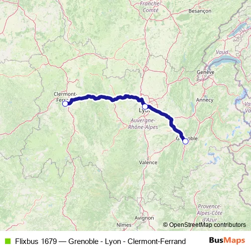 The first stop of the Flixbus 1679 bus route is Grenoble (Central Bus Station) and the last stop is Clermont-Ferrand (Bus Station). Flixbus 1679 (Grenoble - Lyon - Clermont-Ferrand) is operational during on weekends.