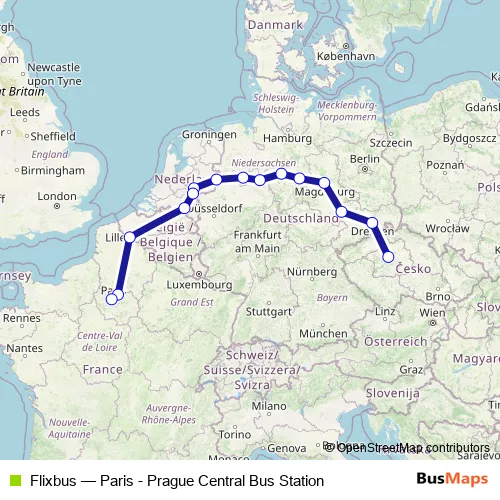 The first stop of the Flixbus bus route is Prague Burger King Florenc Bus Station and the last stop is Paris Pershing-Porte Maillot. Flixbus (Paris - Prague Central Bus Station) is operational during everyday.