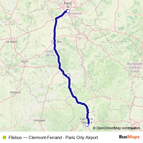 The first stop of the Flixbus bus route is Clermont Ferrand Bus Station and the last stop is Paris Orly Sud airport Parking P4c. Flixbus (Clermont-Ferrand - Paris Orly Airport) is operational during everyday.