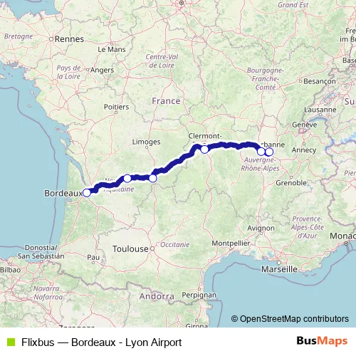 The first stop of the Flixbus bus route is Lyon Saint Exupéry Airport T3 and the last stop is Bordeaux Paludate. Flixbus (Bordeaux - Lyon Airport) is operational during on weekends.