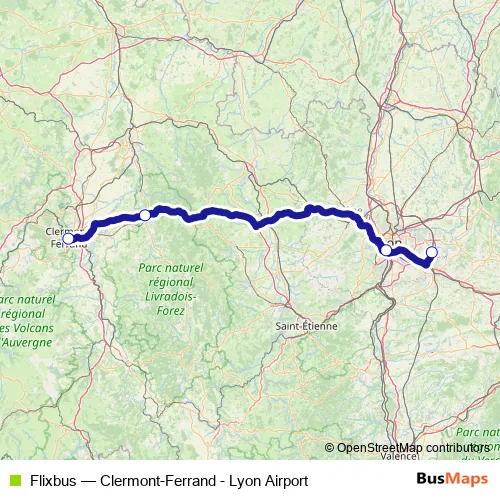The first stop of the Flixbus bus route is Clermont Ferrand Bus Station and the last stop is Lyon Saint Exupéry Airport T3. Flixbus (Clermont-Ferrand - Lyon Airport) is operational during everyday.