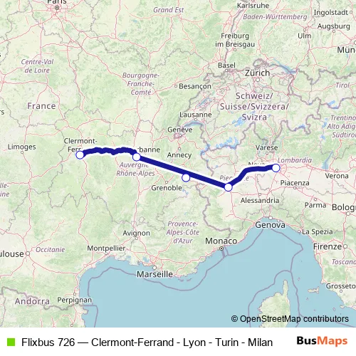 The first stop of the Flixbus 726 bus route is Milan (Lampugnano bus station) and the last stop is Clermont-Ferrand (Bus Station). Flixbus 726 (Clermont-Ferrand - Lyon - Turin - Milan) is operational during everyday.