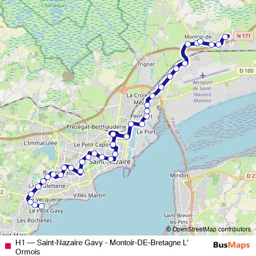 The first stop of the H1 bus route is Gavy and the last stop is Montoir l'Ormois. H1 (Saint-Nazaire Gavy - Montoir-DE-Bretagne L’Ormois) is operational during everyday.