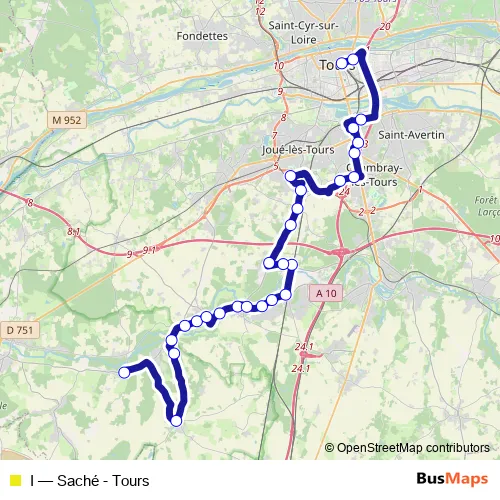 The first stop of the I bus route is Centre and the last stop is Halte Routière. I (Saché - Tours) is operational during everyday.