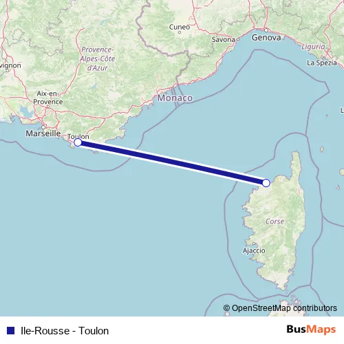 The first stop of the Ile-Rousse - Toulon ferry route is Ile-Rousse and the last stop is Toulon. Ile-Rousse - Toulon is operational during on weekends.