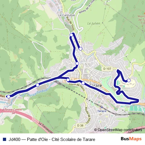 The first stop of the Jd400 bus route is Tarare La Patte d'Oie and the last stop is Tarare Cité Scolaire de Tarare. Jd400 (Patte d'Oie - Cité Scolaire de Tarare) is operational during on weekdays.