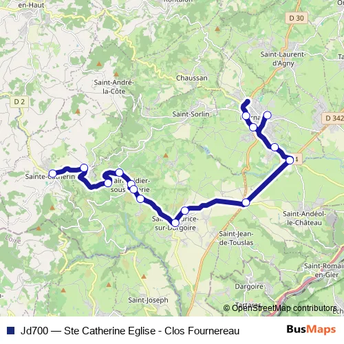 The first stop of the Jd700 bus route is Ste-Catherine Eglise and the last stop is Mornant St Thomas d'Aquin. Jd700 (Ste Catherine Eglise - Clos Fournereau) is operational during on weekdays.