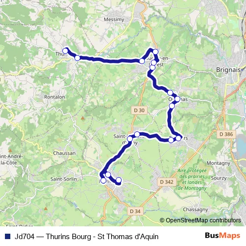 The first stop of the Jd704 bus route is Mornant St Thomas d'Aquin and the last stop is Thurins Bourg. Jd704 (Thurins Bourg - St Thomas d'Aquin) is operational during on weekdays.