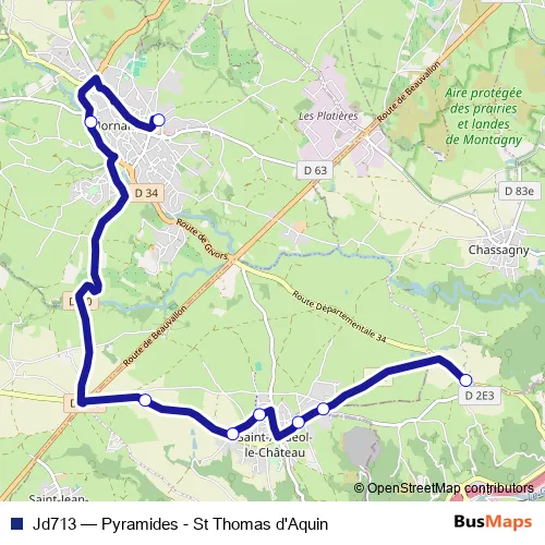 The first stop of the Jd713 bus route is Beauvallon Pyramides and the last stop is Mornant St Thomas d'Aquin. Jd713 (Pyramides - St Thomas d'Aquin) is operational during on weekdays.