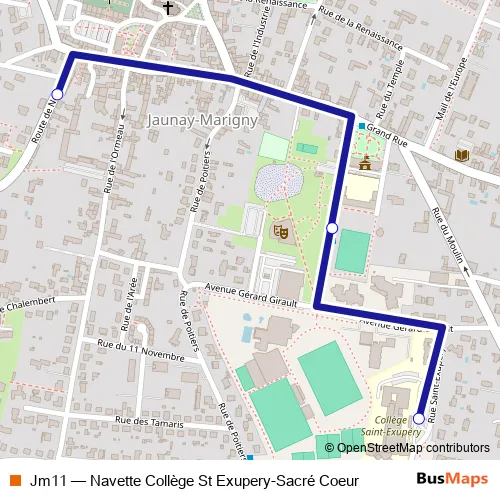 The first stop of the Jm11 bus route is Sacré Coeur and the last stop is Collège Saint Exupéry. Jm11 (Navette Collège St Exupery-Sacré Coeur) is operational during on weekdays.