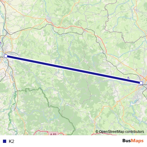 The first stop of the K2 bus route is Vichy and the last stop is Roanne. K2 is operational during on weekdays.