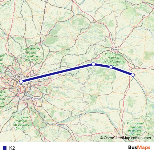 The first stop of the K2 bus route is Paris-Est and the last stop is Châlons-en-Champagne. K2 is operational during everyday.
