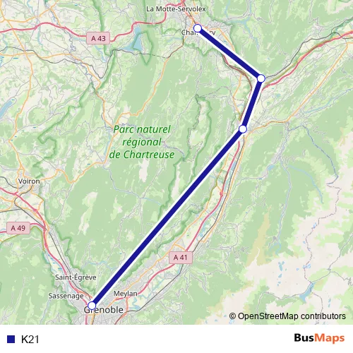 The first stop of the K21 bus route is Grenoble-Gare-Routière and the last stop is Chambéry-Challes-les-Eaux. K21 is operational during everyday.