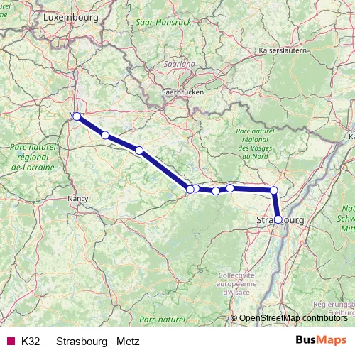 The first stop of the K32 rail route is Strasbourg and the last stop is Metz. K32 (Strasbourg - Metz) is operational during everyday.