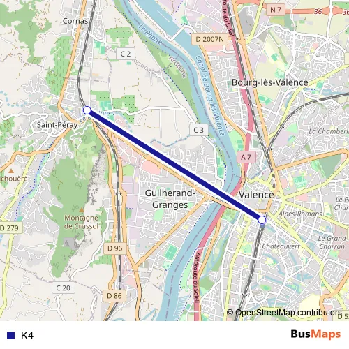 The first stop of the K4 bus route is Saint-Péray and the last stop is Valence Gare Routière. K4 is operational during everyday.