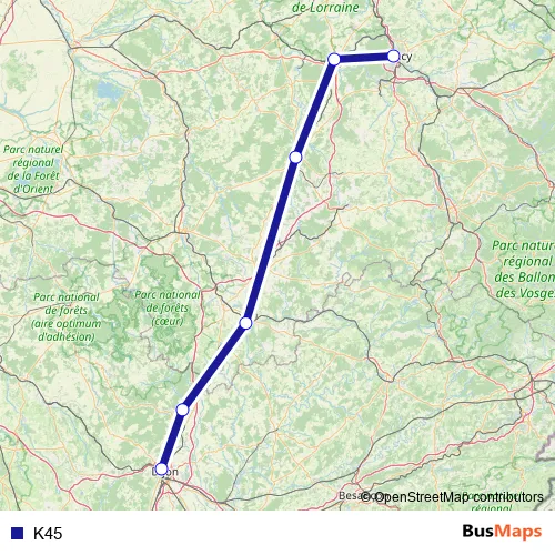 The first stop of the K45 bus route is Neufchâteau and the last stop is Dijon. K45 is operational during everyday.