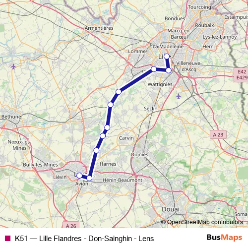 The first stop of the K51 rail route is Lens and the last stop is Lille Flandres. K51 (Lille Flandres - Don-Sainghin - Lens) is operational during everyday.