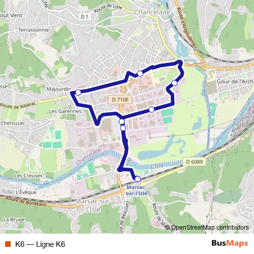 The first stop of the K6 bus route is Halte ferroviaire Marsac and the last stop is Halte ferroviaire Marsac. K6 (Ligne K6) is operational during on weekdays.