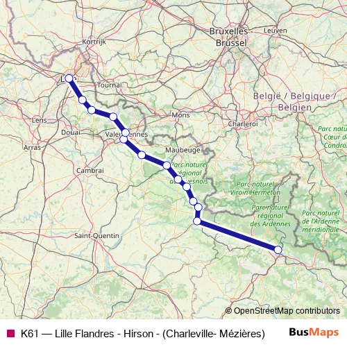 The first stop of the K61 rail route is Charleville-Mézières and the last stop is Lille Flandres. K61 (Lille Flandres - Hirson - (Charleville- Mézières)) is operational during everyday.