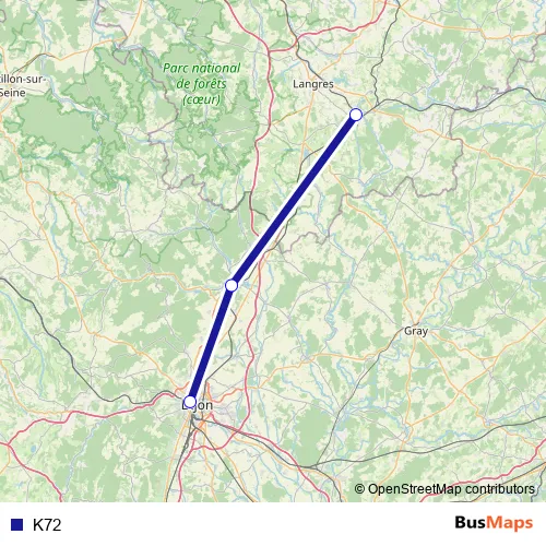The first stop of the K72 bus route is Châlons-en-Champagne and the last stop is Culmont - Chalindrey. K72 is operational during everyday.