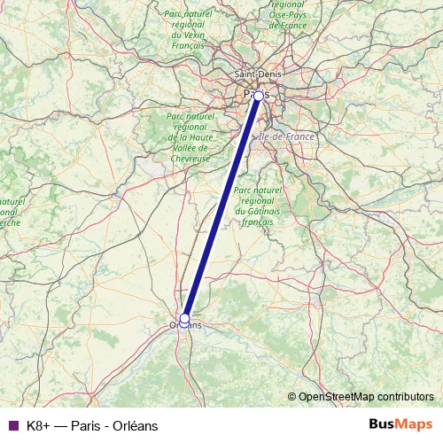 The first stop of the K8+ rail route is Les Aubrais and the last stop is Saint-Pierre-des-Corps. K8+ (Paris - Orléans) is operational during everyday.
