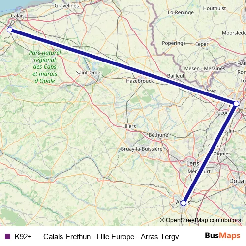 The first stop of the K92+ rail route is Arras and the last stop is Calais - Fréthun. K92+ (Calais-Frethun - Lille Europe - Arras Tergv) is operational during on weekdays.