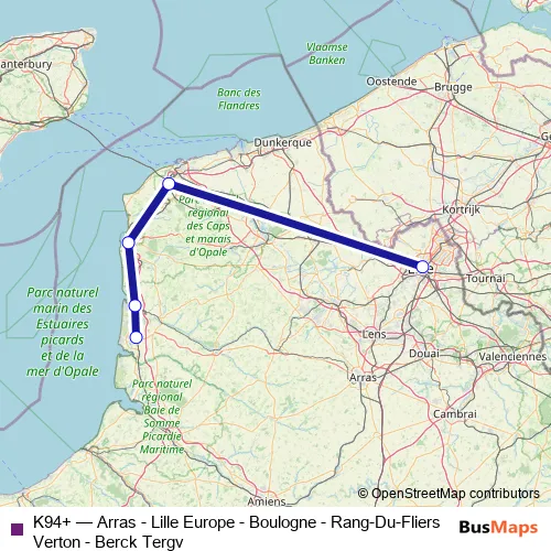 The first stop of the K94+ rail route is Lille Europe and the last stop is Boulogne sur Mer. K94+ (Arras - Lille Europe - Boulogne - Rang-Du-Fliers Verton - Berck Tergv) is operational during everyday.
