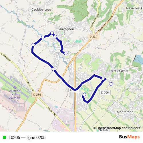 The first stop of the L0205 bus route is Serres Castet College R. Forgues and the last stop is Sauvagnon Taillades. L0205 (ligne 0205) is operational during on weekdays.