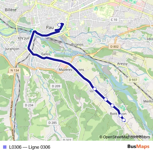 The first stop of the L0306 bus route is PAU Bld Barbanegre and the last stop is Rontignon Cimetiere. L0306 (Ligne 0306) is operational during on weekdays.
