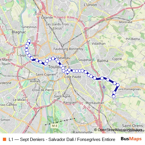 The first stop of the L1 bus route is Sept Deniers - Salvador Dali and the last stop is Fonsegrives Entiore. L1 (Sept Deniers - Salvador Dali / Fonsegrives Entiore) is operational during everyday.