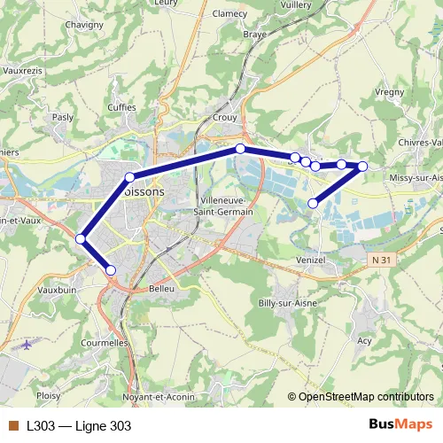 The first stop of the L303 bus route is Soissons-LE Corbusier and the last stop is Bucy-LES Grevieres. L303 (Ligne 303) is operational during on weekdays.