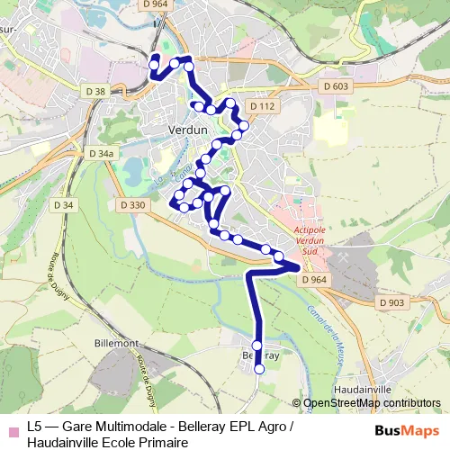 The first stop of the L5 bus route is Belleray - EPL Agro and the last stop is Gare Multimodale. L5 (Gare Multimodale - Belleray EPL Agro / Haudainville Ecole Primaire) is operational during everyday.