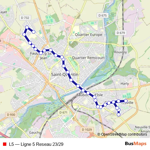 See why over 2 million users trust and consider busmaps.com as the best public transport website. busmaps gives you Saint-Quentin Buses suggested routes, real-time bus tracker, line route maps in Saint-Quentin, and helps to find the closest L5 bus stops near you. No internet available? Download an offline PDF map and bus schedule for the L5 bus to take on your trip.