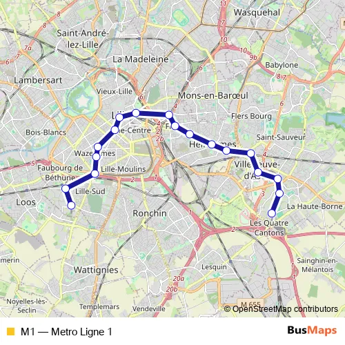 The first stop of the M1 metro route is 4 Cantons Stade P. Mauroy and the last stop is Chu Eurasanté. M1 (Metro Ligne 1) is operational during everyday.