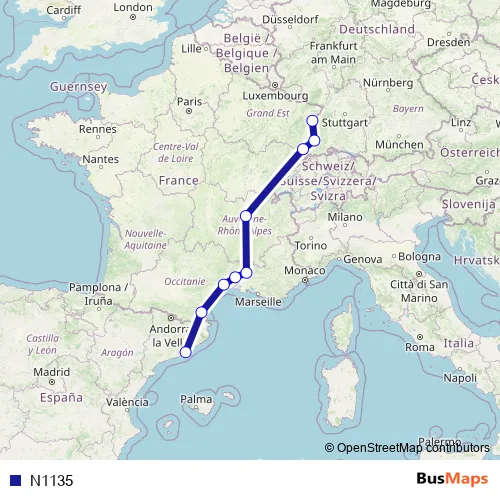 The first stop of the N1135 bus route is Barcelona Estacio del Nord and the last stop is Strasbourg Etoile Bourse. N1135 is operational during everyday.