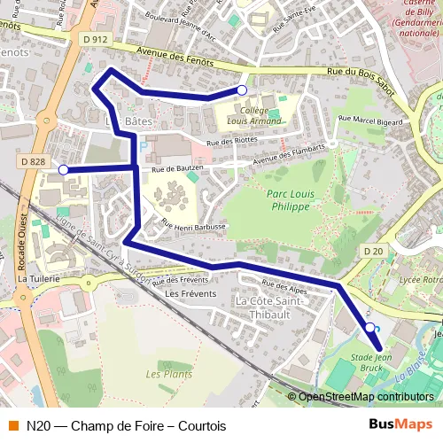 The first stop of the N20 bus route is Collège Louis Armand and the last stop is Champ de Foire. N20 (Champ de Foire – Courtois) is operational during on weekdays.