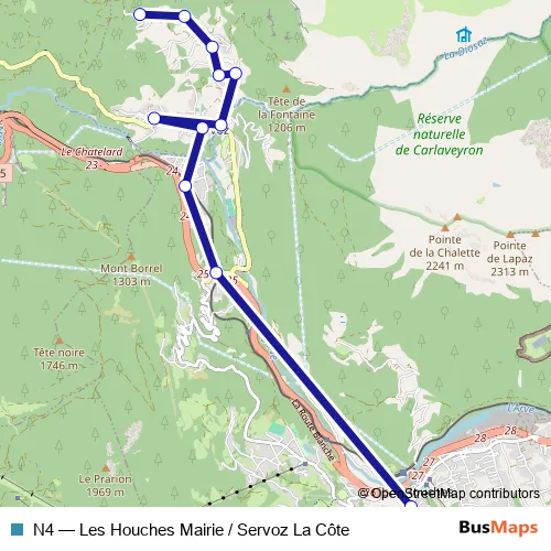 See why over 2 million users trust and consider busmaps.com as the best public transport website. busmaps gives you Servoz Buses suggested routes, real-time bus tracker, line route maps in Servoz, and helps to find the closest N4 bus stops near you. No internet available? Download an offline PDF map and bus schedule for the N4 bus to take on your trip.