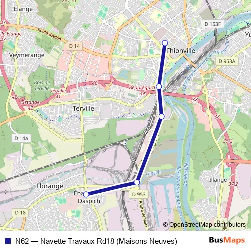 The first stop of the N62 bus route is Ebange Eglise and the last stop is Foch Liberté. N62 (Navette Travaux Rd18 (Maisons Neuves)) is operational during everyday.