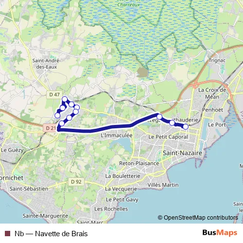 The first stop of the Nb bus route is Fondeline and the last stop is Gare de St Nazaire. Nb (Navette de Brais) is operational during on weekdays.