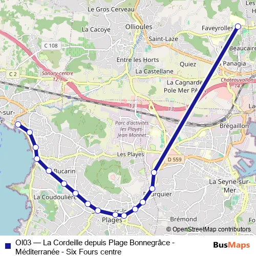The first stop of the Ol03 bus route is Cordeille and the last stop is Plage Bonnegrâce. Ol03 (La Cordeille depuis Plage Bonnegrâce - Méditerranée - Six Fours centre) is operational during on weekdays.