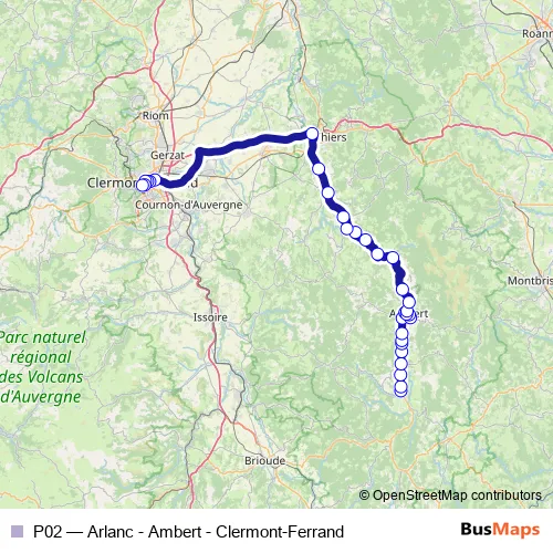 The first stop of the P02 bus route is Place Charles de Gaulle and the last stop is Gare Routière. P02 (Arlanc - Ambert - Clermont-Ferrand) is operational during everyday.