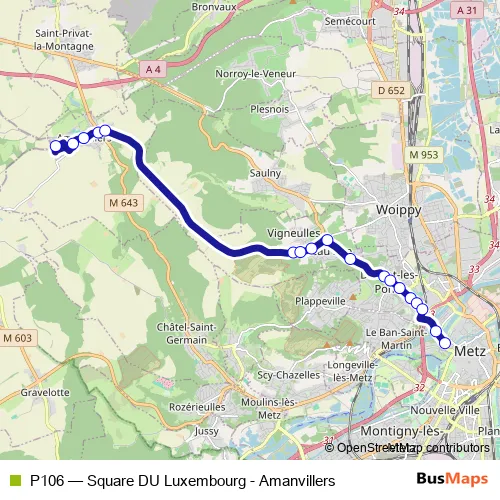 See why over 2 million users trust and consider busmaps.com as the best public transport website. busmaps gives you Metz Buses suggested routes, real-time bus tracker, line route maps in Metz, and helps to find the closest P106 bus stops near you. No internet available? Download an offline PDF map and bus schedule for the P106 bus to take on your trip.
