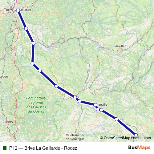 The first stop of the P12 rail route is Rodez and the last stop is Brive-la-Gaillarde. P12 (Brive La Gaillarde - Rodez) is operational during everyday.