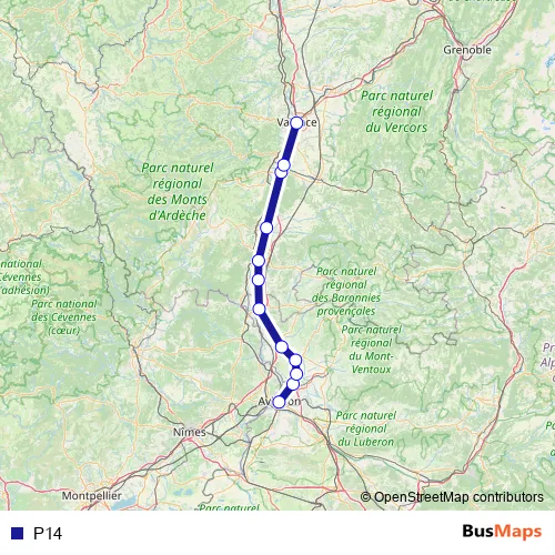 The first stop of the P14 rail route is Avignon Centre and the last stop is Valence. P14 is operational during everyday.